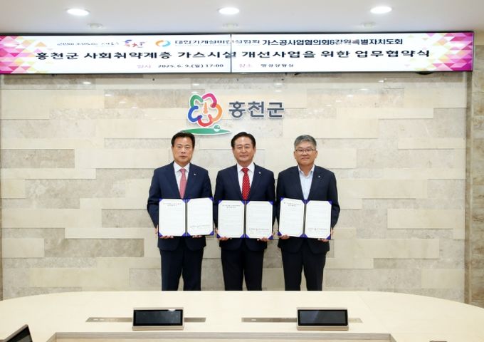 홍천군은 6월 9일 군청 행정상황실에서 대한기계설비건설협회 가스공사업협의회, 강원특별자치도회와 함께 '사회취약계층 가스시설 개선사업'을 위한 업무협약을 체결했다고 밝혔다.