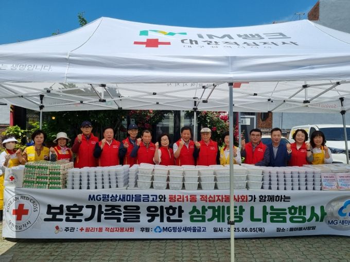 이번 나눔 행사는 이번 행사는 대한적십자사의 급식 차량 지원을 받아 진행됐으며, 평상새마을금고 홍보위원 10명, 적십자사 회원 15명이 참여해 이른 아침부터 닭을 손질하고 씻어 인삼, 대추, 마늘, 녹두, 한약재를 듬뿍 넣은 영양 삼계탕과 국수 세트를 준비해, 보훈 가족, 다문화 가정, 저소득 취약계층, 경로당 등 총 250세대에게 관내 통장들을 통해 전달했다.