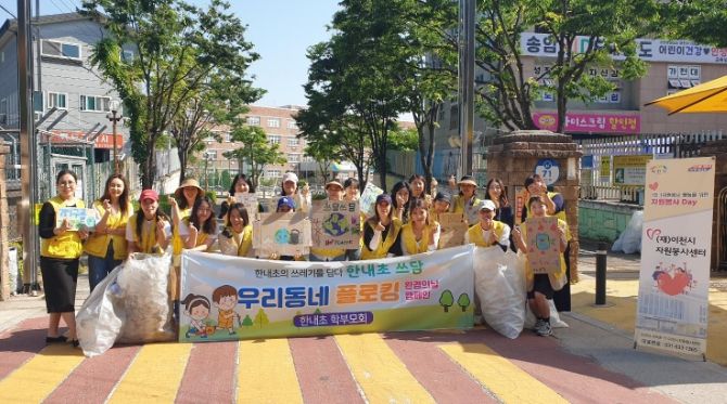 우리 동네 플로깅 ‘한내초 쓰담’ 캠페인에는 한내초등학교 학부모회(회장 김혜진)와 교직원, 학생 등 660여 명이 참여했으며 학생들은 등교 시 각 가정에 모아 두었던 투명 페트병을 수거함에 넣으며 분리배출을 통한 탄소중립 실천과 환경보호의 중요성을 체험했다.