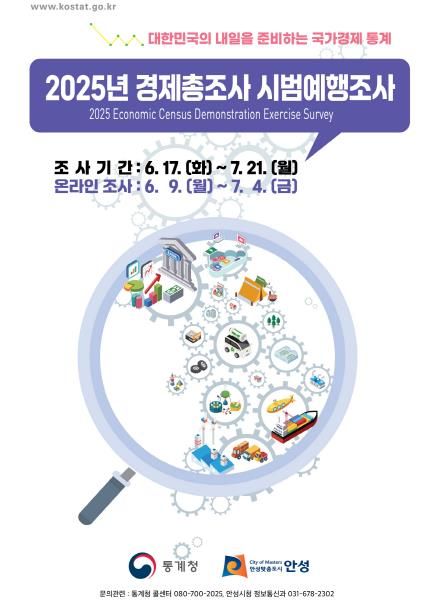 [경남도민뉴스= 기자] 안성시는 통계청이 주관하는 ‘2025년 경제총조사 시범예행조사’를 6월 9일부터 7월 21일까지 관내 사업체를 대상으로 실시한다고 밝혔다.