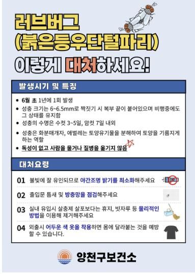 한편 구는 주민들이 러브버그에 대한 생태적 기능을 이해하고 올바른 대응법을 실천할 수 있도록 인식제고를 위한 홍보도 적극 해나간다는 계획이다. 구에 따르면 ‘야간조명 밝기 줄이기’, ‘출입문 틈새 및 방충망 점검’, ‘외출 시 어두운색 옷 착용’ 등이 주요 권장 사항이다.