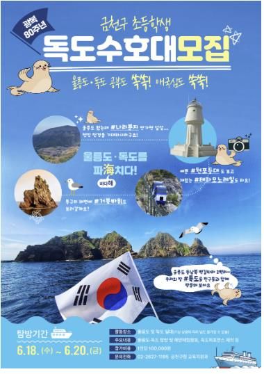 금천구는 18일부터 20일까지 2박3일 동안 관내 초등학교 5·6학년 23명 대상으로 ‘광복 80주년 금천구 독도수호대’ 프로그램을 운영한다고 밝혔다.
