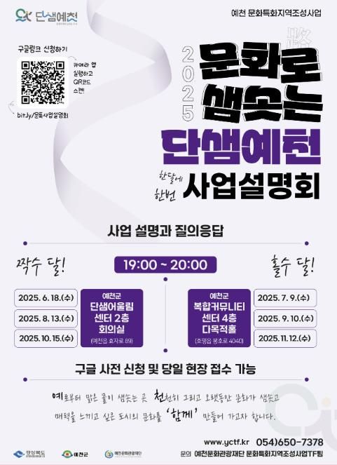 또한 6월 말부터는 군민 누구나 수시로 사업내용을 접할 수 있도록 소개 영상을 예천문화관광재단 홈페이지와 공식 SNS 채널을 통해 공개할 예정이다.