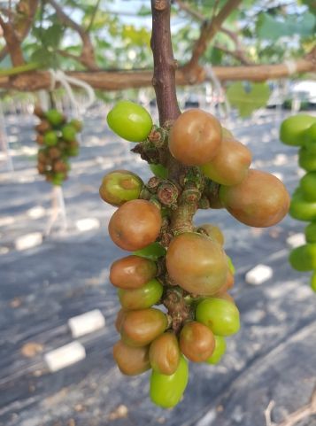 축과는 포도알의 일부가 움푹 파이고 갈색으로 변하는 현상으로, 포도알의 수분이 급격히 빠져나가며 나타나는 생리장해 중 하나다. 특히 장마 이후 갑작스러운 고온이 이어질 경우, 뿌리의 수분 흡수량보다 잎의 증산량이 많아져 발생이 증가하며, 이로 인해 수확량 감소는 물론 상품과 비율까지 급격히 낮아질 수 있다.