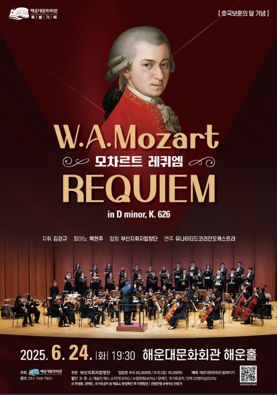 [경남도민뉴스=신석주 기자] 해운대문화회관은 해운대문화회관은 호국보훈의 달을 맞아 ‘모차르트 레퀴엠’ 공연을 24일 오후 7시 30분 해운홀에서 개최한다.