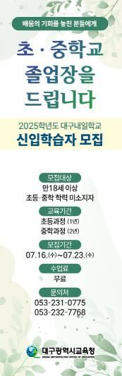 또한, 7월 1일부터 7일까지 도시철도 반월당역에서는 배움의 시기를 놓친 성인들이 학업에 대한 용기를 낼 수 있도록, 졸업생들의 늦깍이 학습과 졸업에 대한 감상을 표현한 ‘세상에서 가장 아름다운 시’시화작품전이 개최된다.