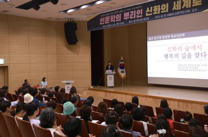 [경남도민뉴스=최재경 기자] 울산 동구는 6월 26일 오전 10시 ‘2025년 달달한 목요 인문학’ 상반기 마지막 강연으로 서울대학교 인문학연구원 김헌 교수를 초청해 ‘인문학의 뿌리인 신화의 세계로’라는 주제의 특별 강연을 진행했다.