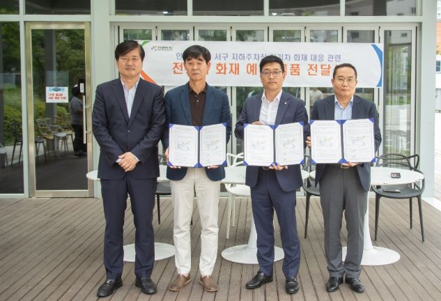 [경남도민뉴스=김용욱 기자] 인천 서구청은 1일 SG E·C, ㈜휴트로, 청라제일풍경채 2차 아파트 입주자 대표와 함께 ‘전기차 화재 예방 물품 전달식’을 개최했다고 2일 밝혔다.