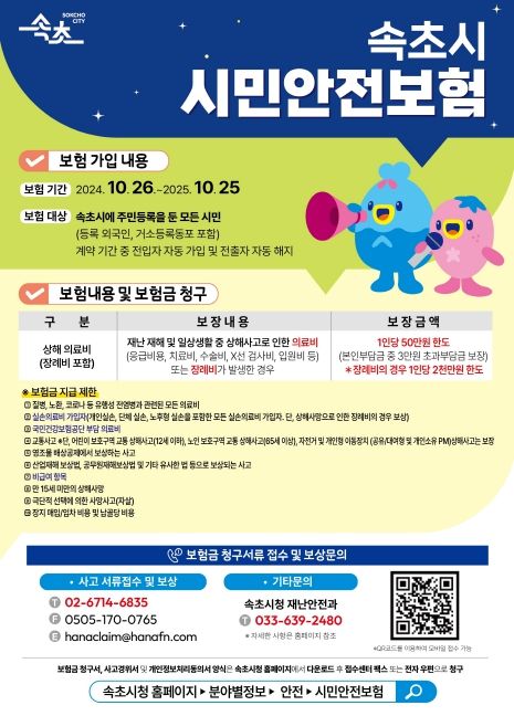 속초시는 예기치 못한 재난, 사고로부터 피해를 당한 시민을 보호하기 위해 속초시 시민안전보험을 운영하고 있다.