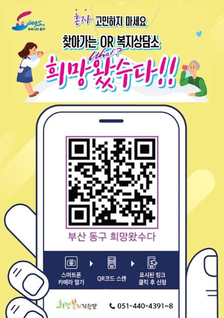 [경남도민뉴스=신석주 기자] 부산 동구는 복지 위기가구를 적극적으로 발굴하고 지원하기 위해, 이달부터 비대면 찾아가는 QR상담소 ‘희망왔수다’ 사업을 운영한다고 밝혔다. 특히 혹서기 기간 동안 집중적으로 추진할 예정이다.