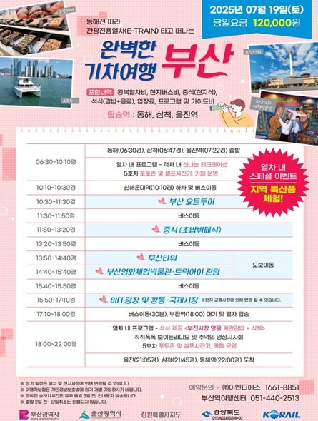 테마관광열차는 '당일치기로 떠나는 완벽한 동해안 여행'을 주제로 ▲7월 17일 삼척/동해, 울진 코스 ▲7월 19일 부산, 울산 코스, 총 4개 코스로 구성된다.