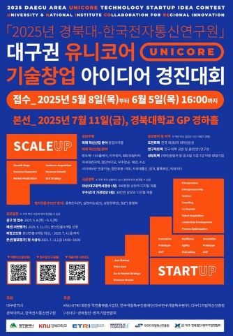 [경남도민뉴스=백상현 기자] 대구광역시는 오는 7월 11일, 경북대학교 글로벌플라자(경하홀)에서 경북대학교, 한국전자통신연구원(ETRI)과 함께 ‘2025년 대구권 유니코어 기술창업 아이디어 경진대회’를 개최한다.
