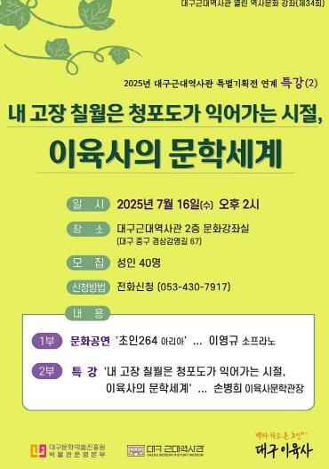 [경남도민뉴스=백상현 기자] (재)대구문화예술진흥원 박물관운영본부 소속 대구근대역사관은 광복 80주년 기념 특별기획전 ‘백마 타고 온 초인(超人), 대구 이육사’ 연계 행사로, 7월 16일 오후 2시, ‘내 고장 칠월은 청포도가 익어가는 시절, 이육사의 문학세계’ 문화공연과 특강을 개최한다.