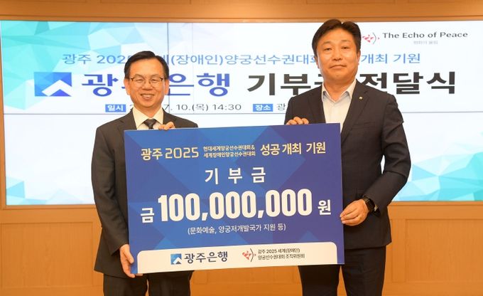[경남도민뉴스=최현인 기자] 광주 2025 세계(장애인)양궁선수권대회 조직위원회(위원장 강기정)는 광주광역시청 비즈니스룸에서 광주은행(은행장 고병일)과 기부금 전달식을 개최했다고 10일 밝혔다.