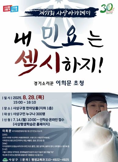 [경남도민뉴스=신석주 기자] 부산 사상구는 오는 8월 28일 오후 3시, 사상구청 한마당홀에서 소리꾼 이희문을 초청해 제71회 사상아카데미를 개최한다.