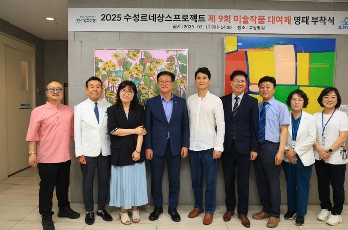 [경남도민뉴스=백상현 기자] 수성문화재단 수성아트피아는 지난 17일 2025년 수성르네상스프로젝트의 일환으로 제9회 ‘미술작품 대여제’명패 부착식을 효성병원에서 2년 연속진행했다.