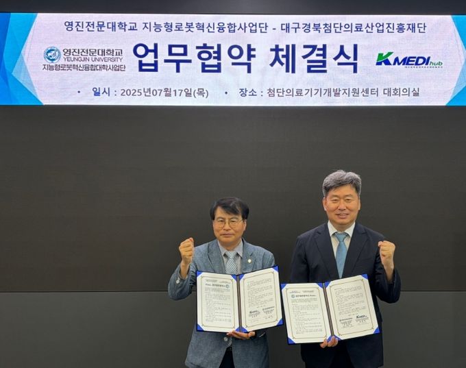 [경남도민뉴스=백상현 기자] 케이메디허브 첨단의료기기개발지원센터가 지난 17일 영진전문대학교 지능형로봇혁신융합대학사업단과 업무협약을 체결했다.