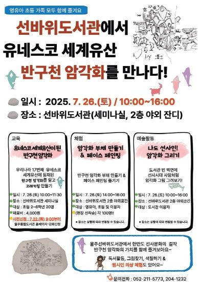 [경남도민뉴스=최재경 기자] 울주선바위도서관이 오는 26일 유네스코 세계유산 ‘반구천 암각화’의 가치를 재조명하고 알리는 어린이 문화체험행사를 개최한다고 20일 밝혔다.
