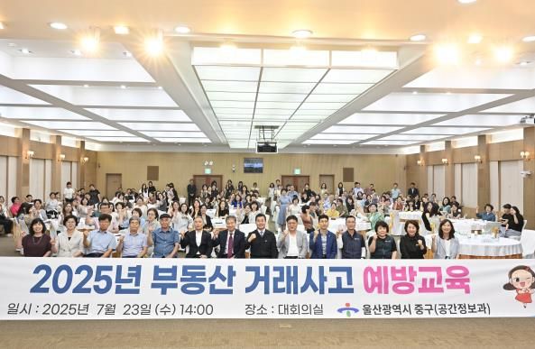 [경남도민뉴스=최재경 기자] 울산 중구가 7월 23일 오후 2시 중구청 대회의실에서 지역 내 개업·소속 공인중개사 150여 명을 대상으로 ‘2025년 부동산 거래사고 예방 교육’을 진행했다.