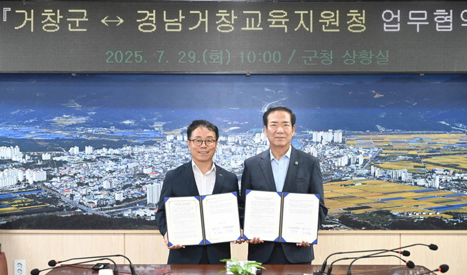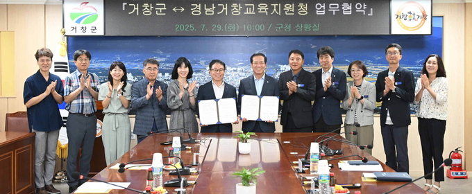 [경남도민뉴스=백형찬 기자] 경상남도거창교육지원청(교육장 신종규)는 지역사회와의 협업으로 미래역량중심 초ㆍ중학교 교육과정을 지원하기 위해 2025년 7월 29일(화) 거창군과 업무협약을 체결했다. 협약식에는 구인모 거창군수와 신종규 교육장 및 관계자 10여 명이 참석했다.