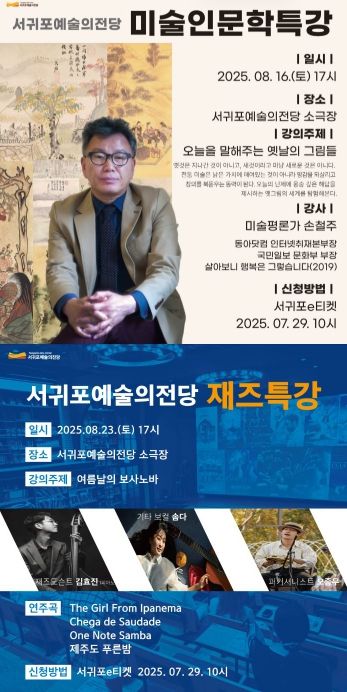 8월 미술사와 재즈 인문학 강좌 참여방법은 7월 29일부터 서귀포e티켓으로 신청할 수 있으며 관람료는 무료로, 자세한 내용은 서귀포예술의전당 홈페이지를 통해 확인할 수 있다.