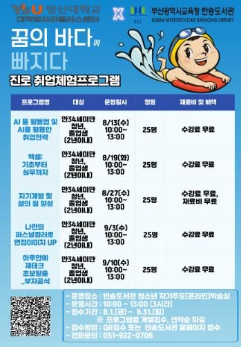 [경남도민뉴스=김채연 기자] 부산광역시립반송도서관은 오는 8월 13일부터 9월 10일까지 반송도서관에서 만34세 미만 청년 125명을 대상으로 진로 취업체험 프로그램 ‘꿈의 바다에 빠지다’를 5회에 걸쳐 운영한다.