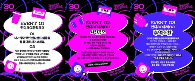 '인디 30주년 기념 페스테벌 & 전시회'는 엠와이뮤직이 주관하고 한국음악연대협동조합이 후원하는 프로그램으로, 한국콘텐츠진흥원의 대중음악 공간기획 지원사업에 선정돼 제작지원을 받는 사업이다.