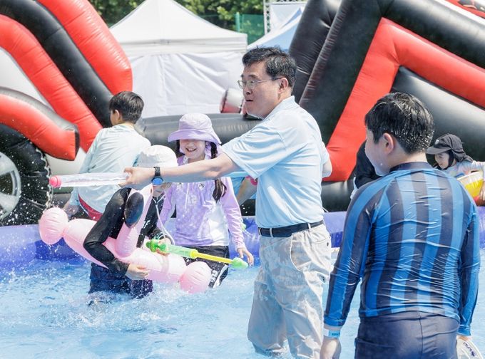 진교훈 구청장도 현장을 찾아 아이들과 함께 물놀이를 하며 시원한 하루를 보냈다.