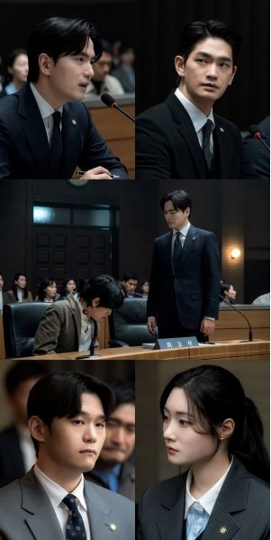 공개된 사진 속에는 상대 변호사의 날 선 시선 속에서도 재판장의 공기를 단숨에 장악하고 있는 윤석훈의 찰나가 담겨 있다.