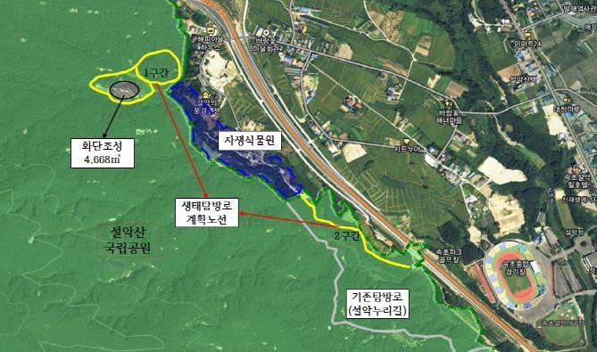 이번 1구간 사업은 노학동 산 337번지 일원에 조성되며, 신규 탐방로 0.69km 개설, 계절초화원(화단) 4,668㎡ 조성, 기존 설악누리길 0.96km 구간 정비가 주요 내용이다.