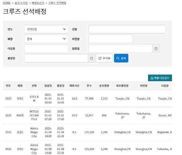 국제 크루즈 선석 배정 내역은 제주도청 누리집 내 [실국 ' 해양수산국 ' 크루즈 선석배정] 메뉴에서 확인할 수 있다.