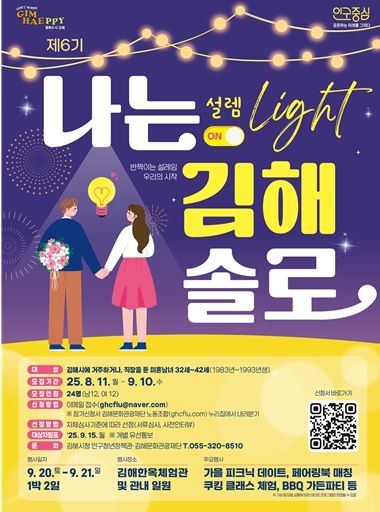시 인구청년정책관 관계자는 “나는 김해솔로는 단순한 만남의 장을 넘어 김해 청년들이 자연스럽게 소통하고 알아가는 기회의 장으로 건강한 관계 형성과 결혼에 대한 긍정적인 인식을 확산시키고자 한다”며 “설렘이 있는 계절, 의미 있는 인연을 기대하는 미혼남녀들의 많은 관심과 참여를 바란다”고 밝혔다.