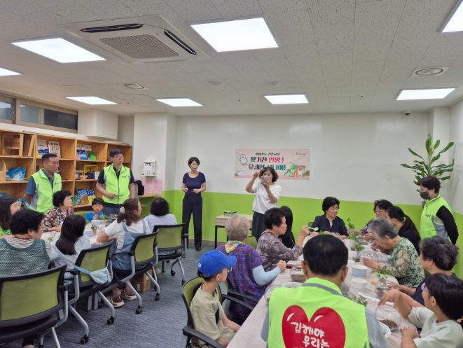 찾아가는 보건복지팀은 어르신들을 대상으로 기본 생활 상담과 기초 건강측정을 통해 만성질환과 사회적 고립 여부를 살폈고, 학생봉사자 및 협의체 위원은 어르신들과 함께 테라리움 만들기 활동을 진행하며 정서적 소통의 시간을 가졌다.
