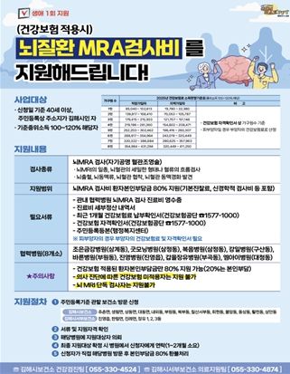 지원 대상자는 40세 이상 기준중위소득 100~120%에 해당하는 김해시민이며 뇌 MRA 검사 시 뇌질환 의심으로 건강보험이 적용되는 경우 검사비 본인 부담금의 80%를 지원한다.