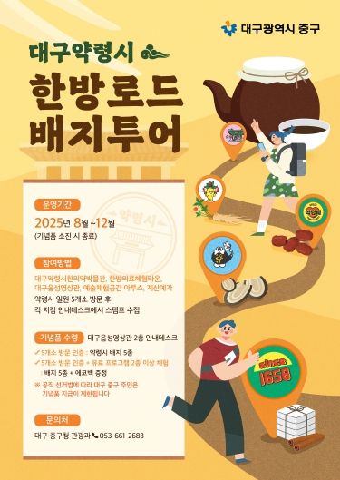 [경남도민뉴스=백상현 기자] 대구 중구는 대구약령시 관광 활성화를 위해 8월 14일부터 연말까지 ‘대구약령시 한방로드 배지투어’를 운영한다고 밝혔다.