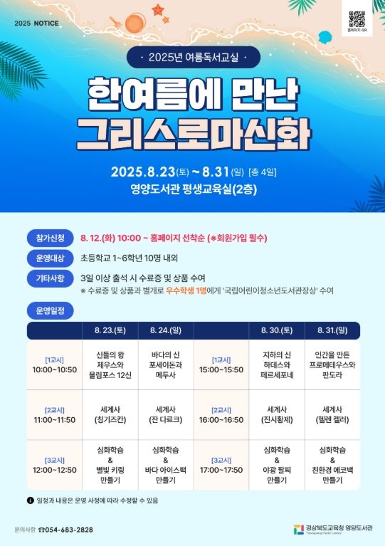 [경남도민뉴스=장강동 기자] 경상북도교육청 영양도서관은 초등학생들에게 신화 속 인물과 이야기를 통해 상상력과 인문학적 소양을 키울 수 있는 기회를 제공하고자 '2025년 여름독서교실 '한여름에 만난 그리스로마신화''를 운영한다.