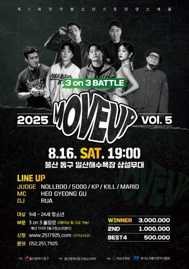 [경남도민뉴스=최재경 기자] 울산광역시 동구가 주최하고 울산광역시 동구청소년센터(센터장 이미영)이 주관하는 제5회 전국청소년 스트릿 댄스배틀 ‘Move Up!’ vol.5가 오는 8월 16일 토요일 오후 7시 동구 일산해수욕장 상설무대에서 개최된다.