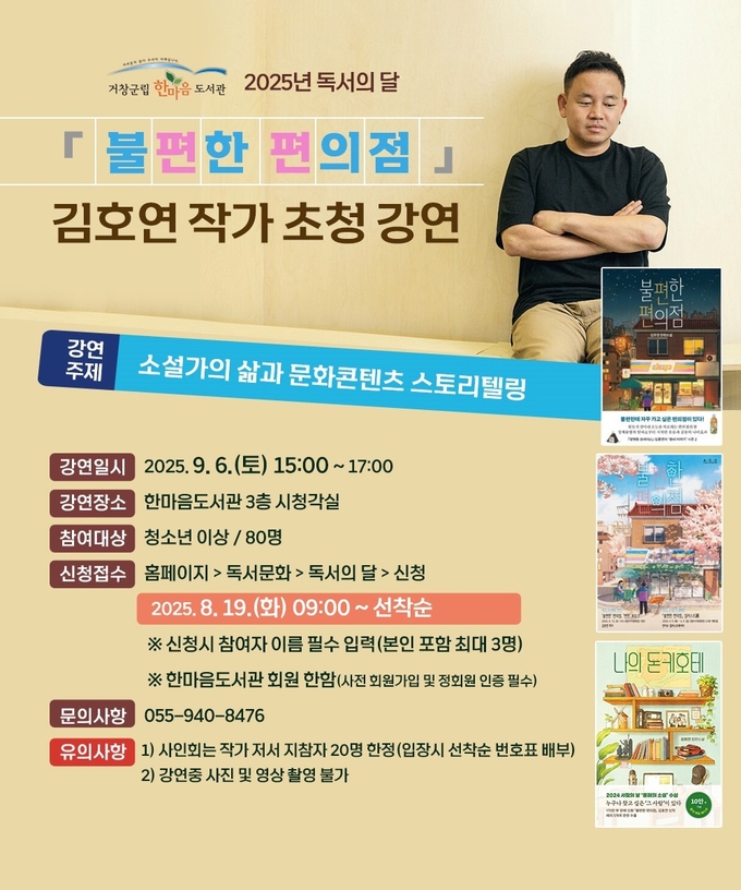 먼저, 9월 6일 오후 3시 ‘불편한 편의점’, ‘나의 돈키호테’의 저자 김호연 작가가 ‘소설가의 삶과 문화콘텐츠 스토리텔링’ 주제로 강연한다. 작가의 창작 에피소드와 스토리텔러로서의 경험을 직접 들을 수 있다.