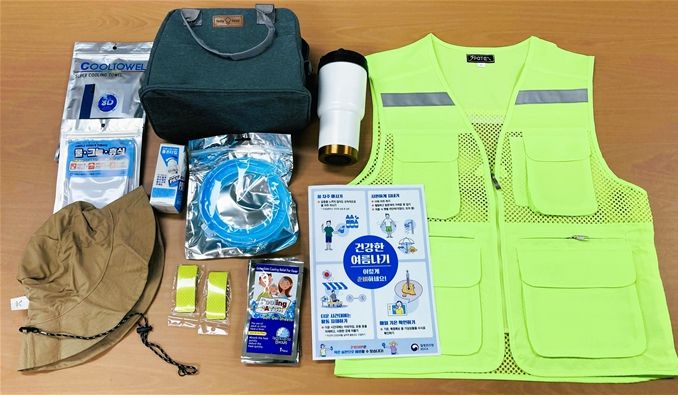 폭염 예방키트는 ▲보냉가방 ▲쿨토시 ▲쿨링타올 ▲넥쿨러 ▲벌레물림치료제 ▲텀블러 ▲모자 ▲야광조끼 등 폭염 및 야간 안전사고 예방을 위한 물품 9종으로 구성되어 있다.