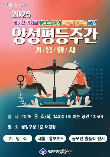 [경남도민뉴스=신석주 기자] 부산시 금정구는 오는 9월 4일 금정구청 1층 대강당에서 2025년 양성평등주간(9.1.~9.7.)을 맞아 양성평등 문화 확산과 인식제고를 위해 구민과 함께하는 기념행사를 개최한다고 밝혔다.