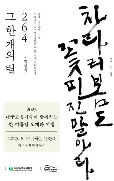 [경남도민뉴스=백상현 기자] 대구시교육청이 광복 80주년을 맞아 8월 21일 오후 7시 30분, 대구오페라하우스에서 대구교육가족을 위한 특별공연‘오페라 '264, 그 한 개의 별'’을 마련했다.