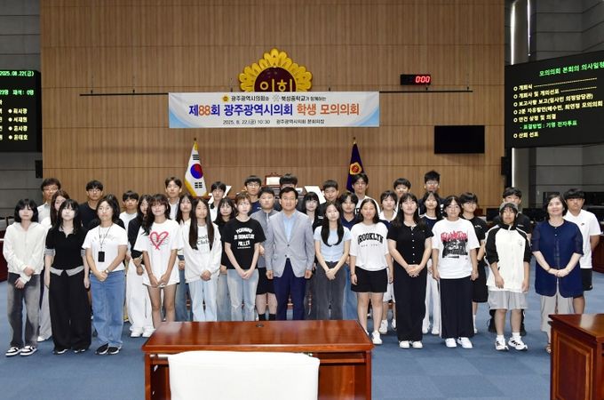 [경남도민뉴스=최현인 기자] 광주광역시의회는 8월 22일 오전 10시 30분 시의회 본회의장에서 북성중학교 학생들을 대상으로 ‘제88회 광주광역시의회 학생 모의의회’를 개최했다.