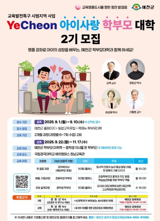 2기 학부모대학은 9월 22일부터 11월 17일까지 6주간 주 1회, 국립경국대학교 예천캠퍼스 청남교육관에서 운영된다.