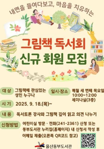 [경남도민뉴스=최재경 기자] 울산 동부도서관은 전문 독서토론 강사와 함께 매월 다양한 그림책을 읽고 의견을 나누며 자기 성찰의 시간을 보내는 그림책 독서회를 창단한다.