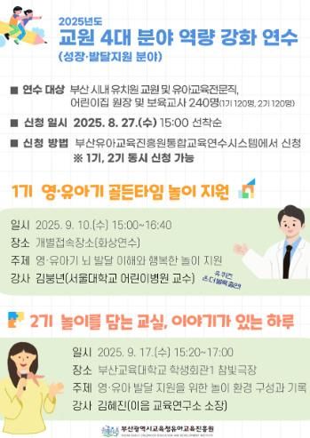 [경남도민뉴스=김채연 기자] 부산광역시교육청유아교육진흥원은 오는 9월 10일(온라인 연수)과 17일(부산교대 참빛극장) 유치원 및 어린이집 교사 240명을 대상으로 ‘성장·발달 지원 연수’를 운영한다.