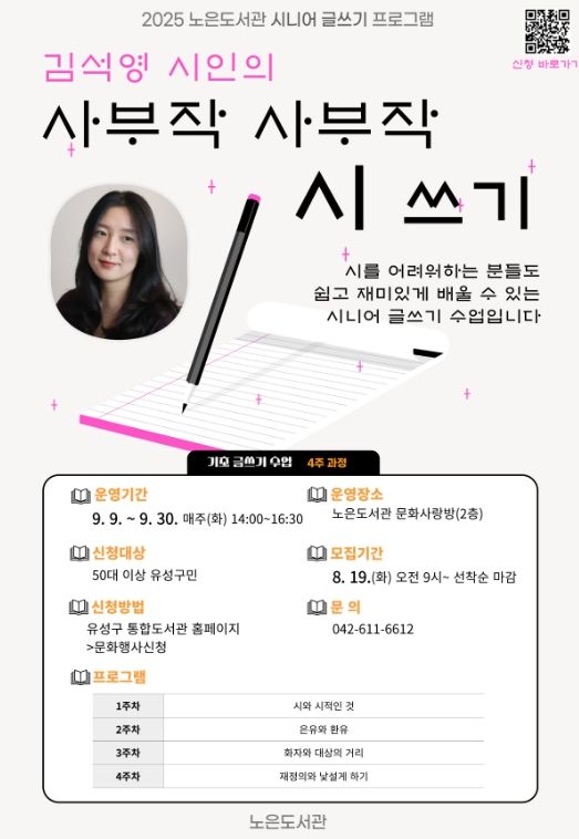 [경남도민뉴스=도문호 기자] 대전 유성구는 9월 독서의 달을 맞아 노은도서관에서 시니어를 위한 글쓰기 프로그램 ‘김석영 시인의 사부작 사부작 시 쓰기’를 운영한다.