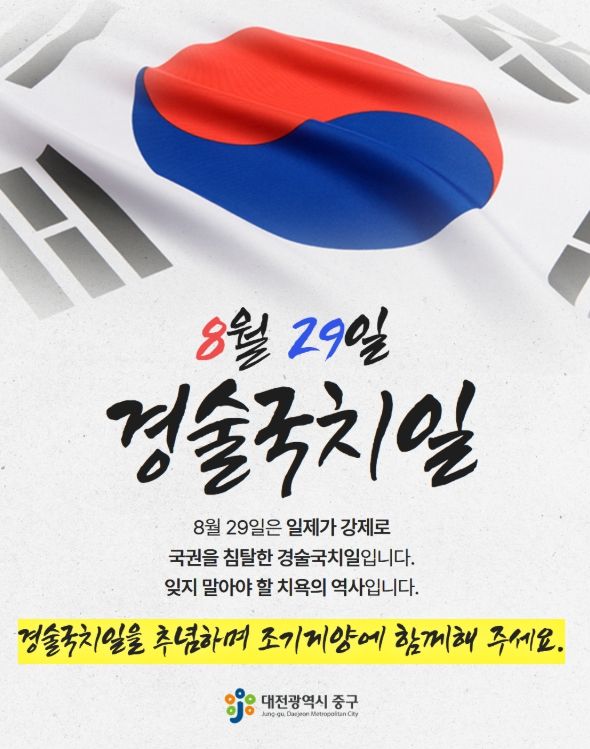 [경남도민뉴스=도문호 기자] 대전 중구는 8월 29일 경술국치일을 맞아 ‘조기 달기 운동’을 추진 한다.