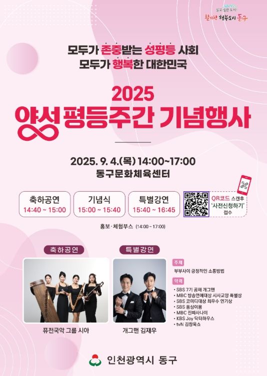 [경남도민뉴스=김용욱 기자] 인천 동구는 오는 9월 4일 양성평등주간을 맞아 동구문화체육센터에서 ‘2025년 양성평등주간 기념행사’를 개최한다고 밝혔다.