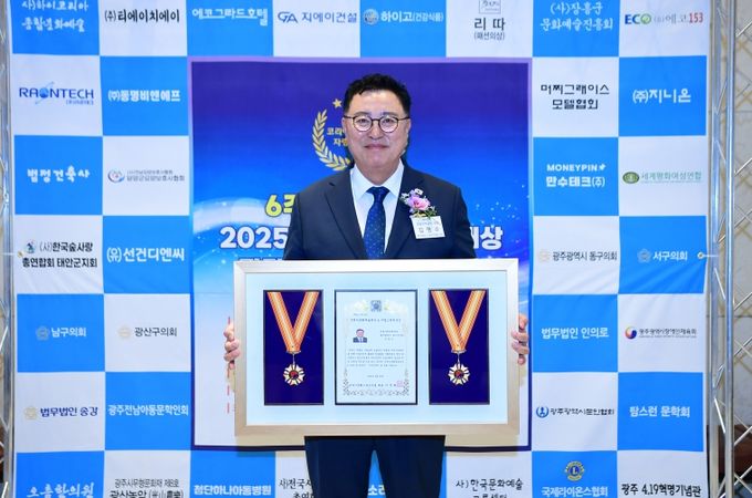 [경남도민뉴스=최현인 기자] 광주 광산구의회 김명수 의장(더불어민주당, 신흥동·우산동·월곡1·2동·운남동)이 28일 글로리아웨딩홀에서 열린 ‘2025 코리아문화예술대상 자랑스런 한국인 시상식’에서 의정부문 ‘기초의회 의정지역공헌 대상’을 수상했다.