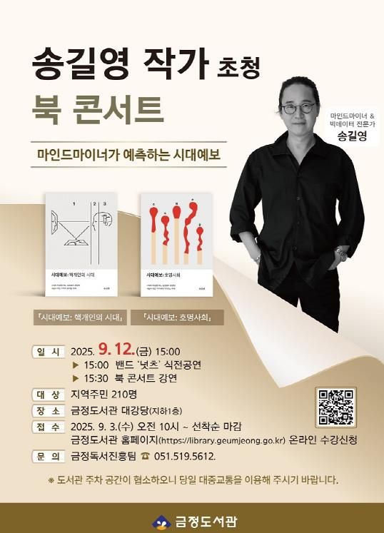북 콘서트는 어쿠스틱 밴드 '넛츠'의 식전 공연 ➲ 저자 강연 ➲ 질의응답 순으로 진행될 예정이며, 접수는 9월 3일 오전 10시부터 선착순으로 청소년 이상 지역 주민 누구나 금정도서관 홈페이지 온라인 수강신청란을 통해 가능하며, 기타 자세한 사항은 금정도서관으로 문의하면 된다.